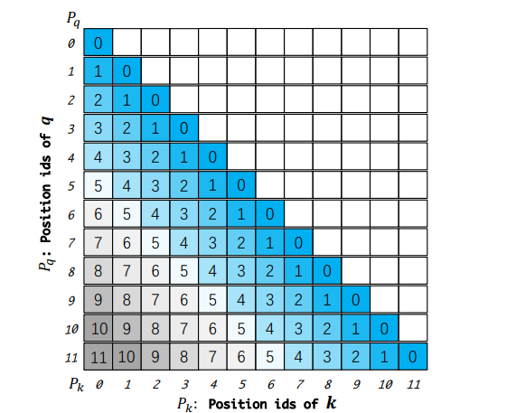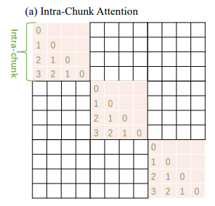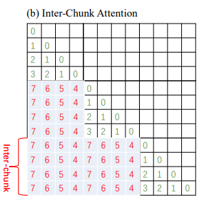 图 片来源:Dual Chunk Attention 论文,用数字来代表相对位置或位置编码。