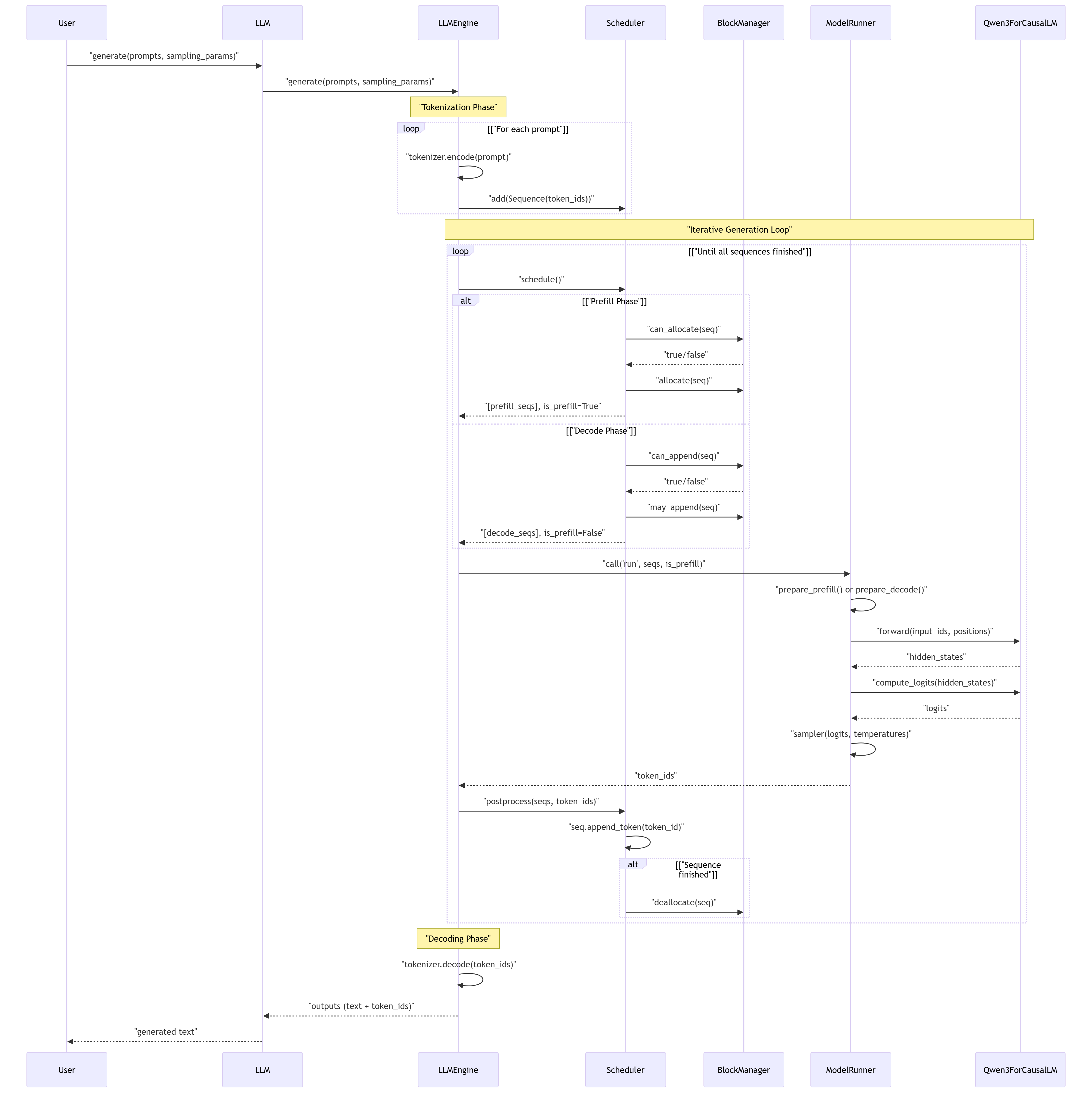 首先,我们通过流程图看一下整个 Nano-vLLM 的工作流程以及各个模块之间的关系。有个宏观的印象。